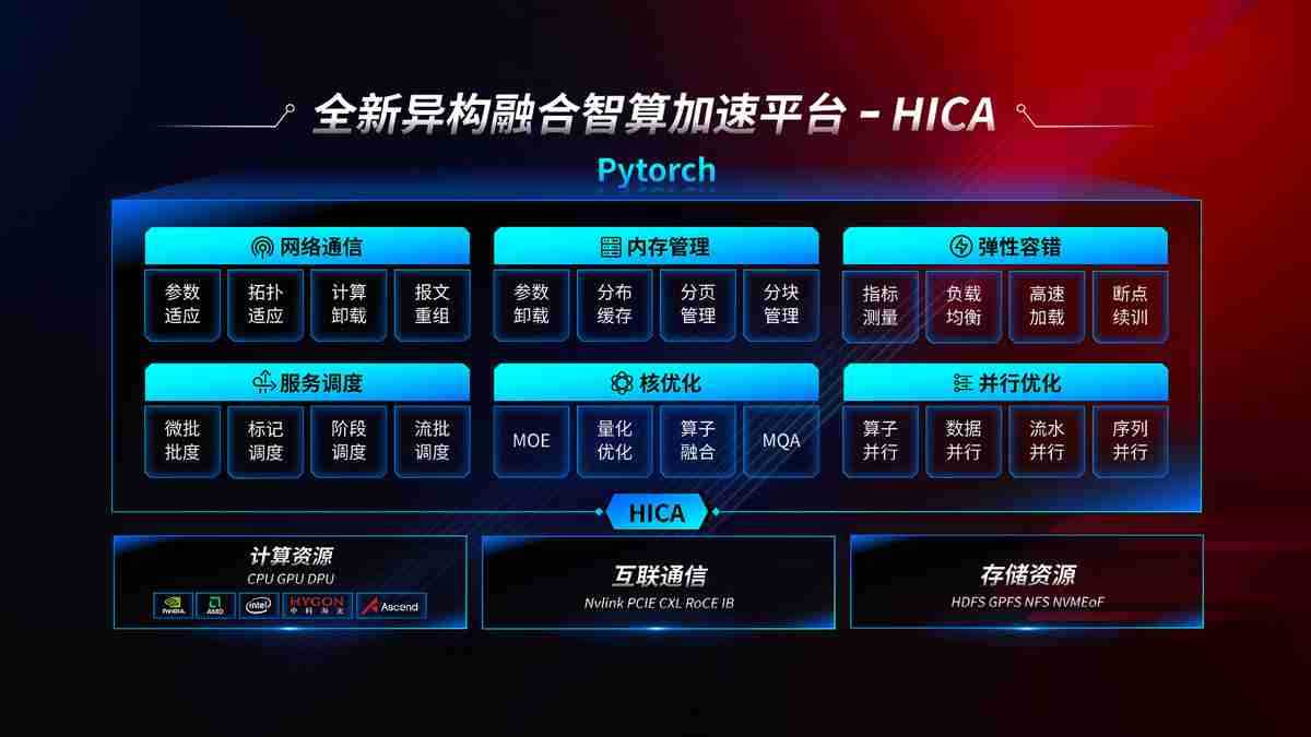 通过自研的服务层、、、中间适配层、、以及调度编排算法,,采用数据并行、、、模型并行等多种并行方式,,,把并行计算任务进行有效的分解,,使其分别由相应的软件栈和算力资源来承接。。。当GPU资源变化,,,HICA可以实时动态调度计算子任务并调整模型拓扑和架构,,,,以充分聚合各种算力资源。。